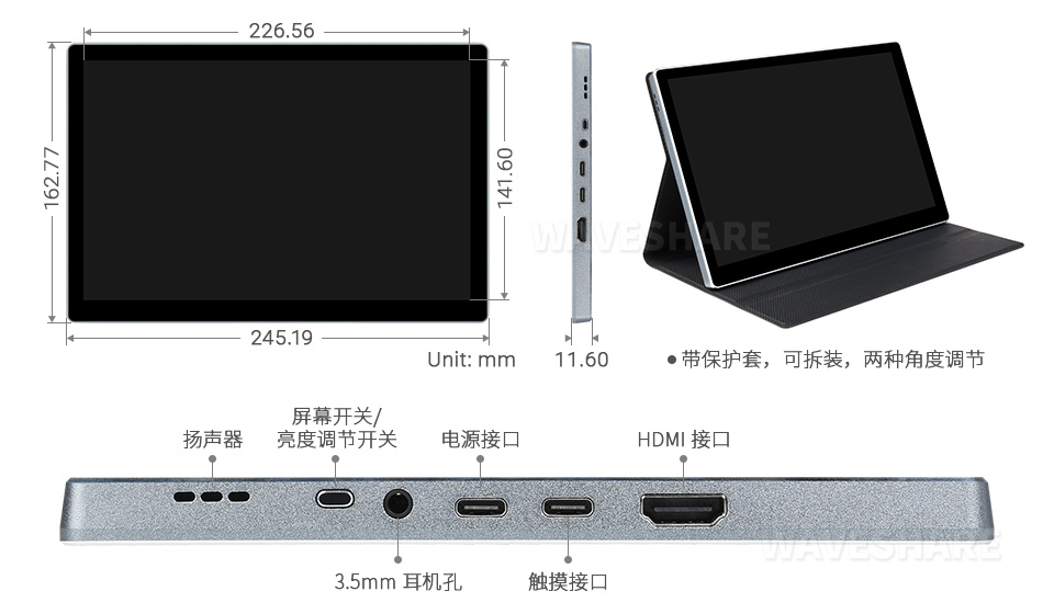 11.6inch HDMI LCD (H) (带外壳) 1920×1080 HDMI/VGA IPS 178° 电容 USB 钢化玻璃