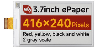 | 3.7inch e-Paper(G) | 红、黄、黑、白 | 2 | 416×240 | 81.54 × 47.04 | 92.99 × 53.00 × 1.00 | 20 | - | - | SPI |