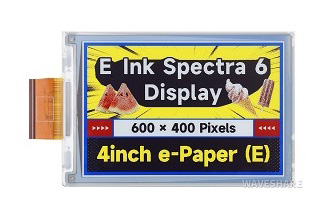 | 4inch e-Paper (E) | E6全彩色 | 2 | 600×400 | 84.60 × 56.40 | 99.00 × 66.00 × 0.85 | 19 | - | - | SPI |
