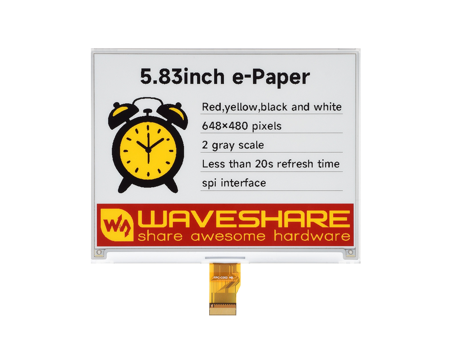 | 5.83inch e-Paper (G) | 红、黄、黑、白 | 2 | 648×480 | 118.78 × 88.22 | 125.40 × 99.50 × 1.20 | 20 | - | - | SPI |