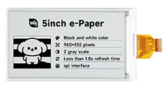| 5inch e-Paper | 黑、白 | 2 | 960×552 | 110.59 × 62.65 | 126.38 × 71.19 × 0.79 | 1.8 | √ | - | SPI |