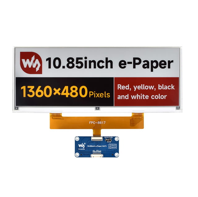 | 10.85inch e-Paper HAT+ (G) | 红、黄、黑、白 | 2 | 1360 × 480 | 259.76 × 91.68 | 270.56 × 105.92 | 21 | - | √ | - | SPI |