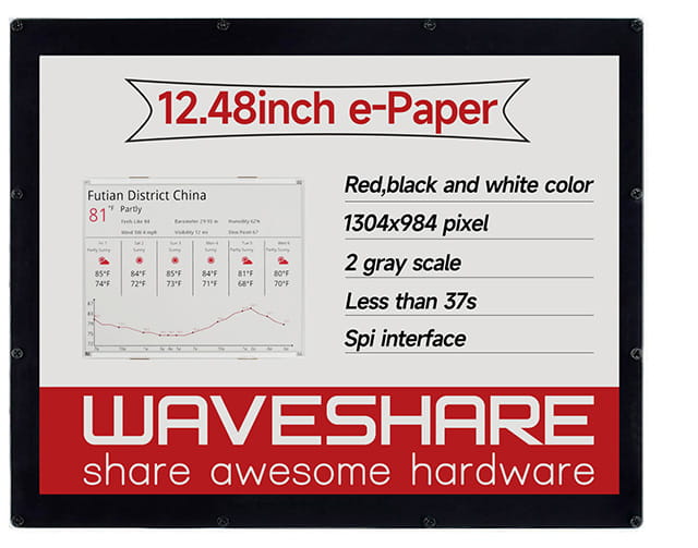 | 12.48inch e-paper Module (B) | 红、黑、白 | 2 | 1304×984 | 252.98 × 190.90 | 280.00 × 229.50 | 37 | - | √ | - | SPI |