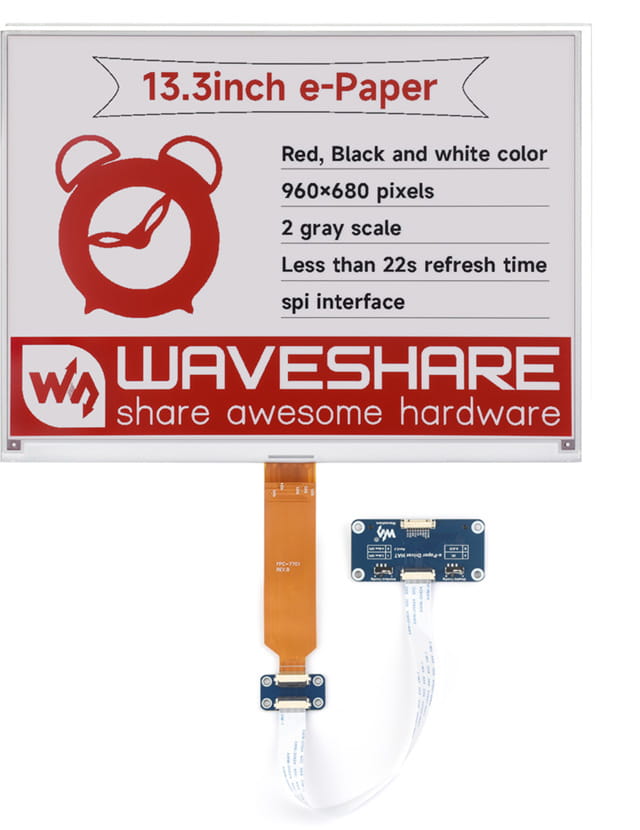 | 13.3inch e-Paper HAT (B) | 红、黑、白 | 2 | 960×680 | 275.52 × 195.16 | 286.32 × 212.26 | 22 | √ | √ | - | SPI |