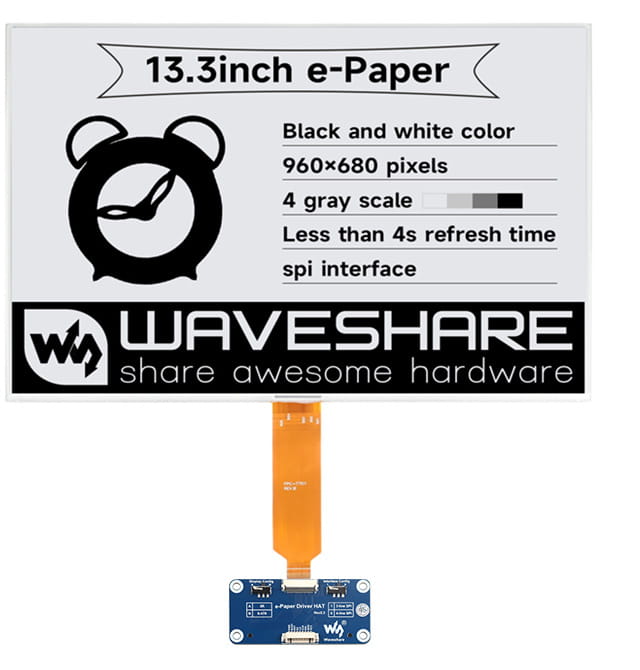 | 13.3inch e-Paper HAT | 黑、白 | 16 | 1600×1200 | 270.40 × 202.80 | 285.80 × 213.65 | <1 | √ | √ | - |