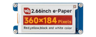 | 2.66inch e-Paper Module (G) | 红、黄、黑、白 | 2 | 360×184 | 60.05 × 30.69 | 85.0 × 38.5 | 26 | - | - | - | SPI |