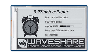 | 3.97inch e-Paper HAT+ | 黑、白 | 4 | 800×480 | 86.40 × 51.84 | 99.50 × 60.00 | 3.5 | √ | √ | - | SPI |