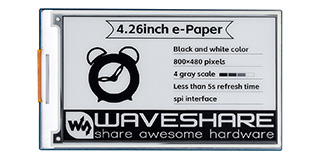 | 4.26inch e-Paper HAT | 黑、白 | 4 | 800×480 | 92.80 × 55.68 | 107.00 × 64.00 | 4 | √ | √ | - | SPI |