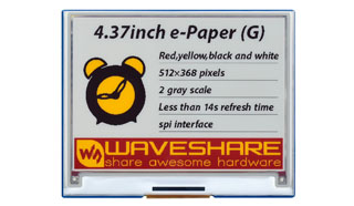 | 4.37inch e-Paper Module (G) | 红、黄、黑、白 | 2 | 512×368 | 90.11 × 64.77 | 101.50 × 81.50 | 14 | - | - | - | SPI |