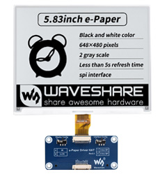 | 5.83inch e-Paper HAT | 黑、白 | 2 | 648×480 | 119.232 × 88.320 | 125.40 × 99.50 | 5 | - | √ | - | SPI |