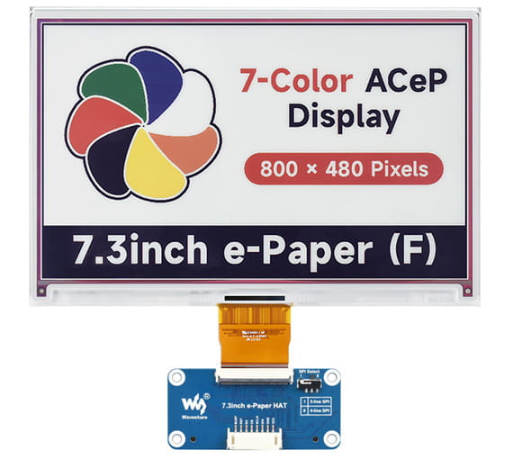 | 7.3inch e-Paper HAT (E) | E6全彩色 | 2 | 800×480 | 160.00 × 96.00 | 170.20 × 111.20 | 12 | - | √ | - | SPI |