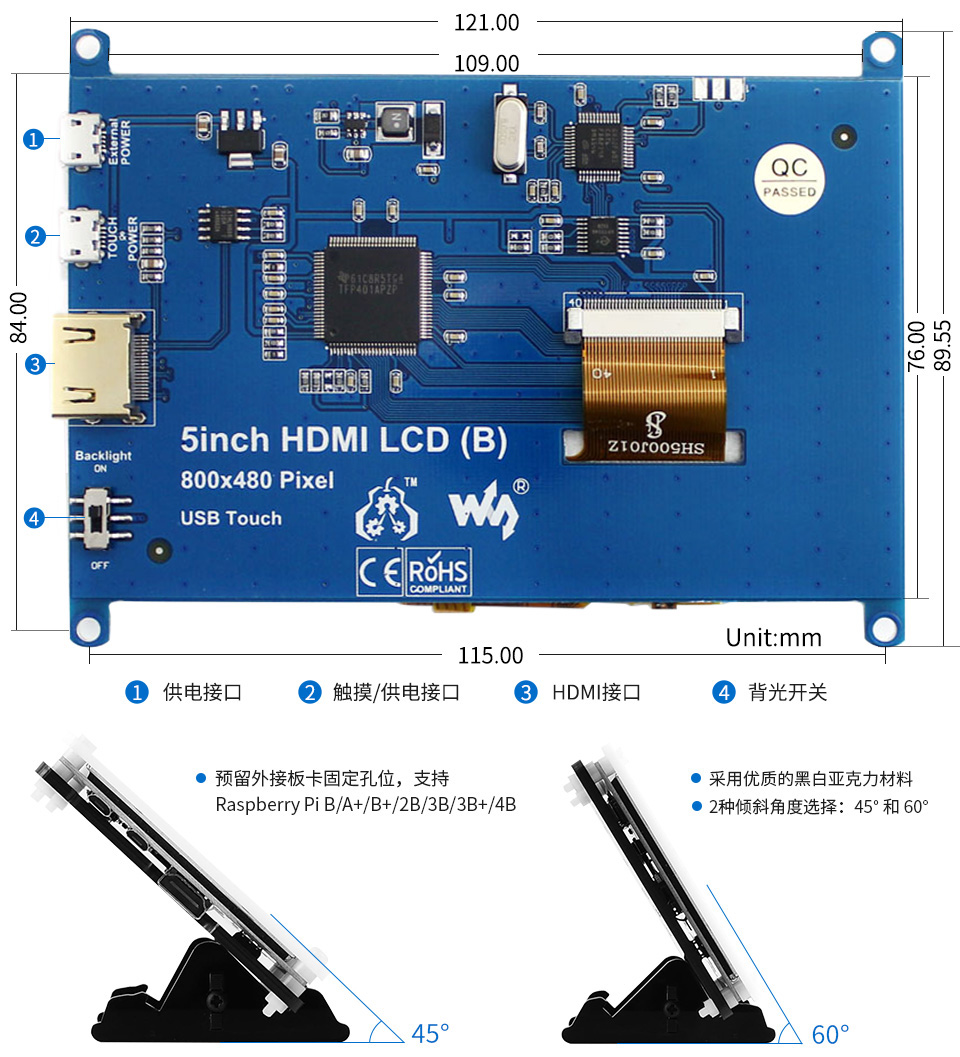 | 5inch HDMI LCD (B) | 800×480 | HDMI | TFT | 160 | 电阻 | USB | - | - | - | - | √ | - | √ |