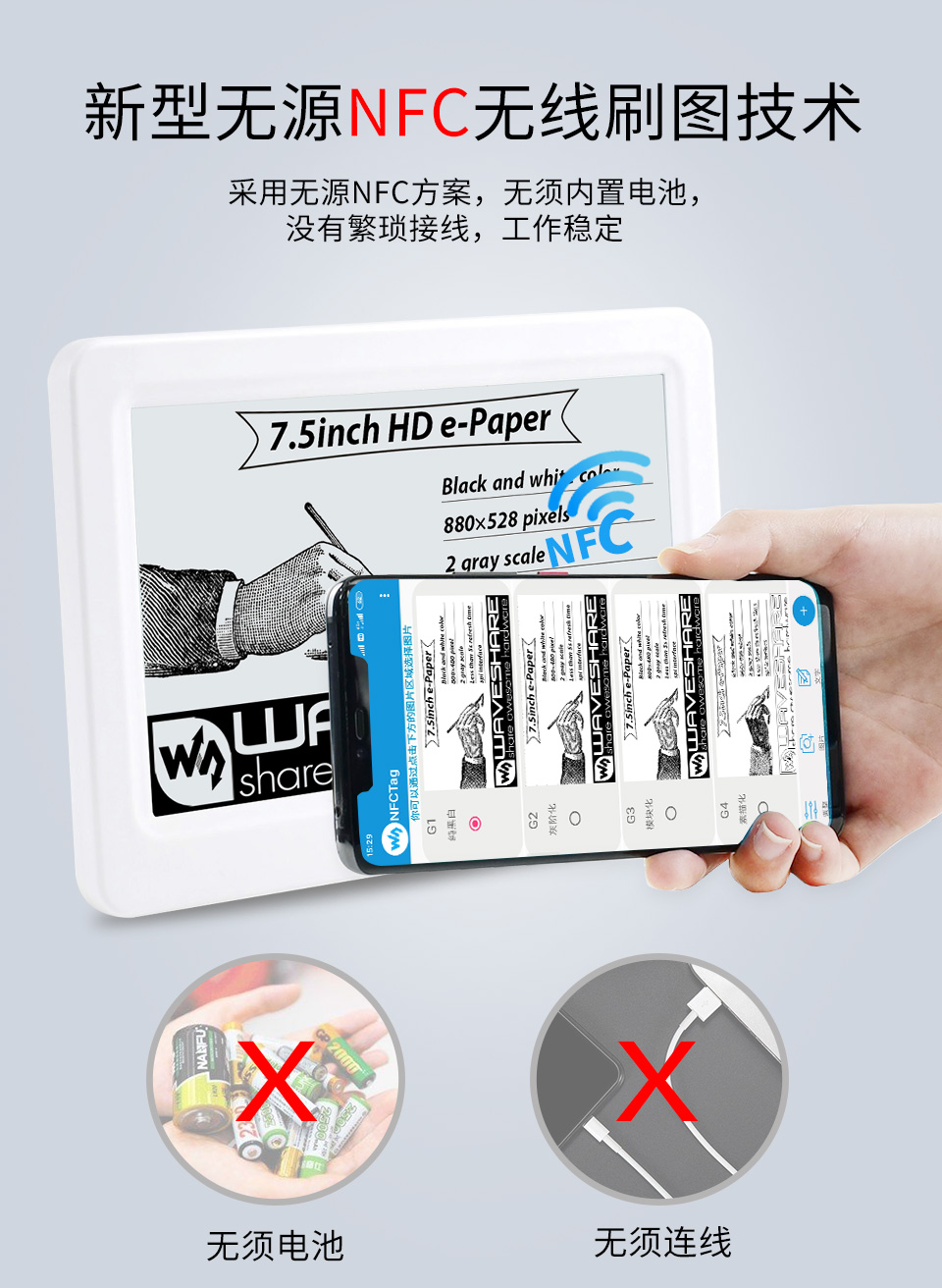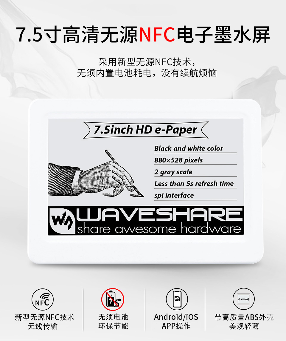 | 4.2inch NFC-Powered e-Paper | 黑、白 | 400 × 300 | 84.80 × 63.60 | 105.00 × 94.10 | 4s | √ | √ |
