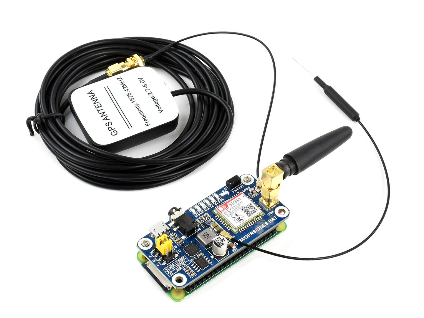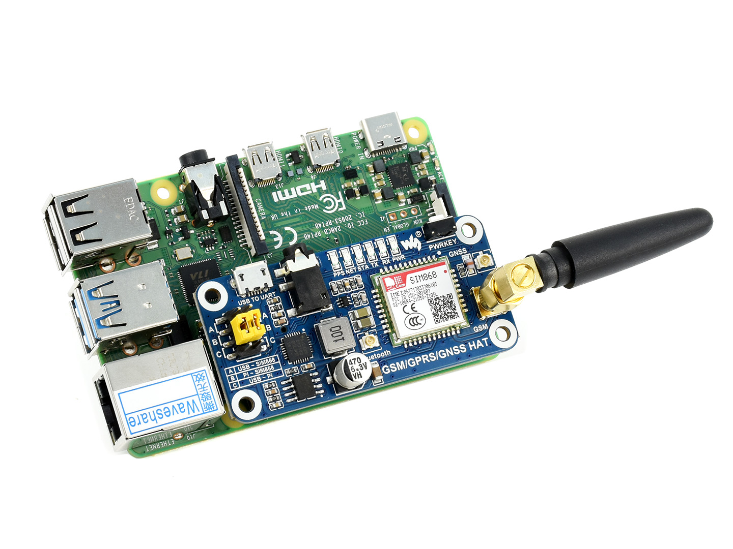 我是一款具有GSM(全球移动通信系统)、GPRS(通用分组无线服务)、GNSS(全球导航卫星系统)和Bluetooth(蓝牙)功能的树莓派扩展板。