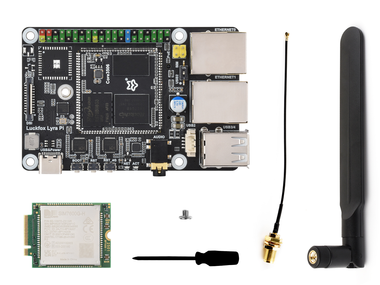 多核异构CPU,板载4G模块M.2接口,DDR3L,兼容树莓派DSI屏幕,Rockchip Matrix IO(共享复用PWM、UART、I2C、SPI和CAN等控制器信号),双10M/100M网口,3.5mm耳机/麦克风接口等 |