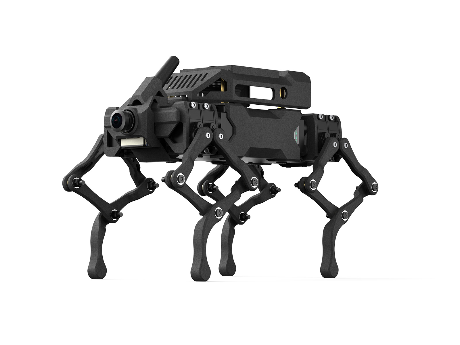 本产品是一款具有高自由度的仿生四足机器狗,2.3kg.cm 串行总线舵机,结构可靠、动作灵活丰富,集成了 9 轴运动跟踪器、RGB 等设备于一身并开源了可跨平台使用的 Web 应用。以 ESP32 作为下位机进行连杆逆解和步态生成,为上位机分担算力,可以安装树莓派 4B / 树莓派 5 作为上位机来运算高阶决策,升级版 WAVEGO Pro 还集成了超广角镜头,可以实现颜色跟踪、运动检测和人脸检测等视觉功能。新增了支持 JSON 协议通信与 ESP-NOW 主从机控制模式,可以将用于机器人控制的 JSON 指令保存为任务文件,通过调用任务文件一键回放机器狗的运动轨迹,便于教育展示与快速演示。