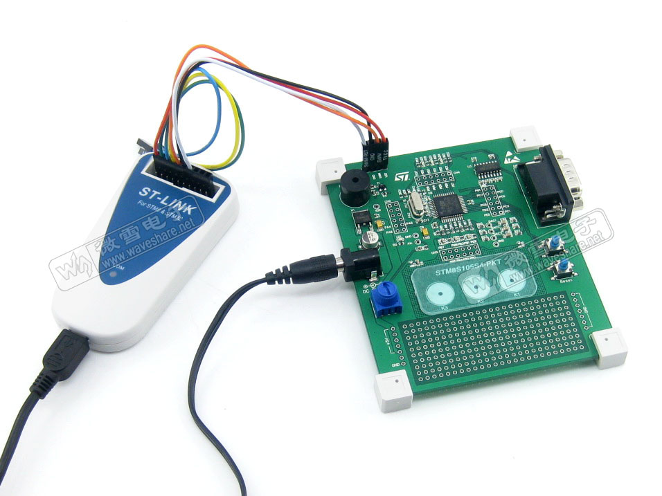ST-LINK下载器通过SWIM接口连接至STM8目标板