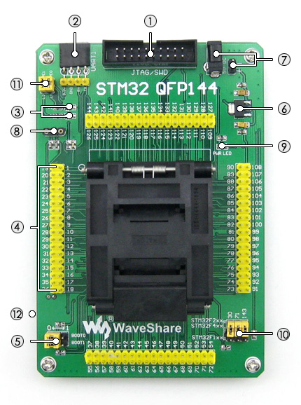 STM32-QFP144 /测试座板载JTAG/SWD标准编程接口,引脚定义如下所示: