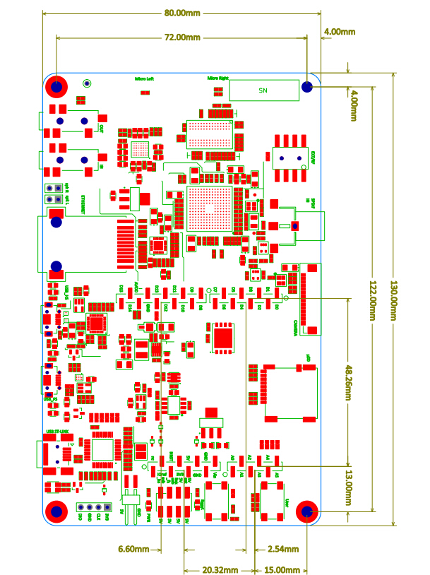 - STM32F746NGH6 microcontroller featuring 1 Mbytes of Flash memory and 340 Kbytes of RAM, in BGA216 package